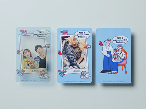2つ目は、写真にちなんでTHIS IS A GOOD MOMENT TO KEEP…!(これは残したい瞬間…!)というイラストを描き下ろしました。写真撮影なのにハンバーガーを食べていたりキャップが落ちてしまっていたりなんだかヘンテコですが、そんな瞬間こそ愛おしくて残しておきたい瞬間だったりしますよね。ぜひそんな瞬間のお写真を当てはめて、形に残していただければと思います。